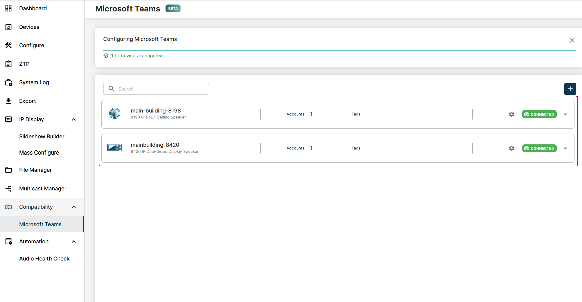 Once connected, Teams-enabled device status is visible within ADMP, providing centralized visibility across deployments. Teams-related configuration changes can also be managed from ADMP, reducing the need for individual device access.